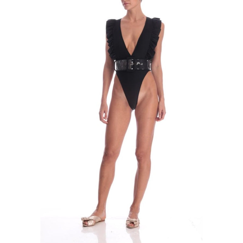 Solid Ruffled High Leg Swimsuit With Belt in Black