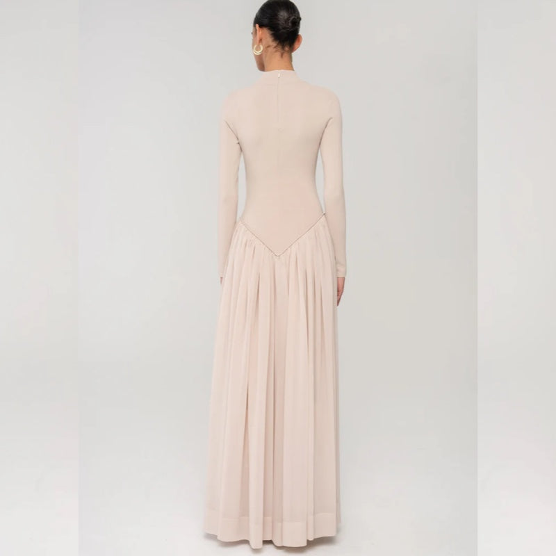 A sweeping silhouette that’s effortlessly refined. The Speck Knit Dress features a soft, ribbed bodice that melts into pleated jersey panels, offering playful movement with every step. Perfect for transitional weather or a city soirée.