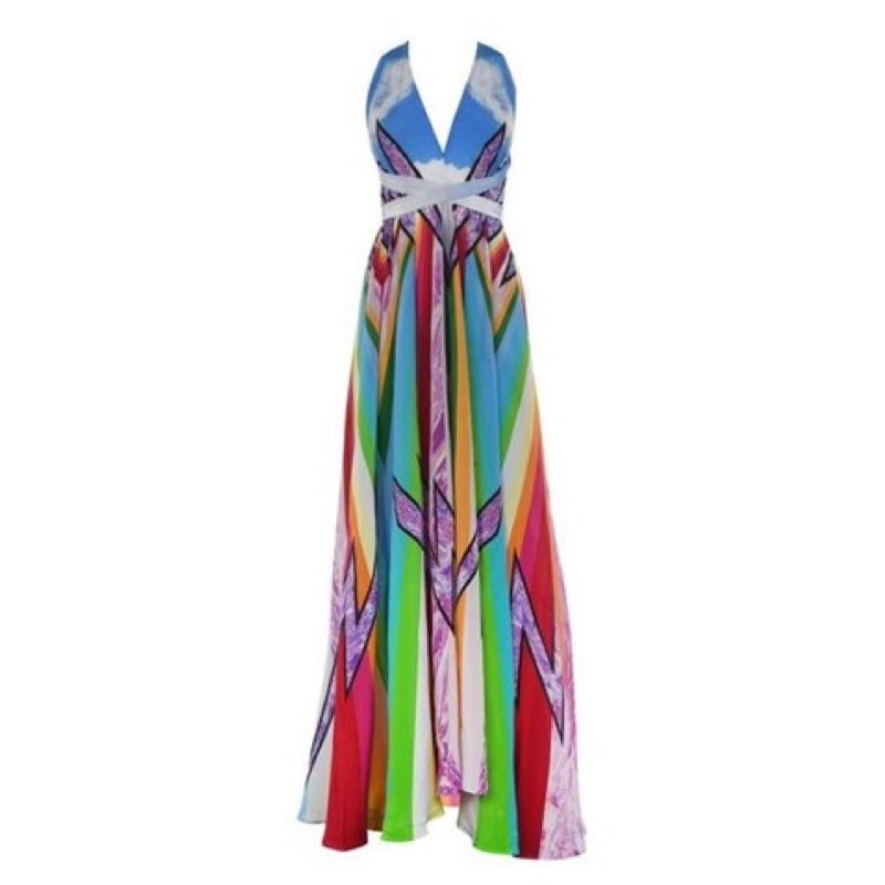 Invest in this gorgeous Play Date Studios Cloud Maxi Dress, a perfect piece for holiday attire or formal wear. This stunning maxi dress is constructed with cropped sleeves, a v neckline, tapered waistline and a below the knee length. This dress is finished off with a rainbow print color way throughout