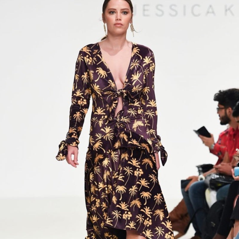 The ‘ Volga’ dress is soaking in palm print, it features a lowcut neckline with center front tie closure over bodice and asymmetrical hem. Unlined, Zipper Fastening Through Back, Front Adjustable Knots On Wrists And Front. 90% Polyester, 10% Elastane. Dry Clean