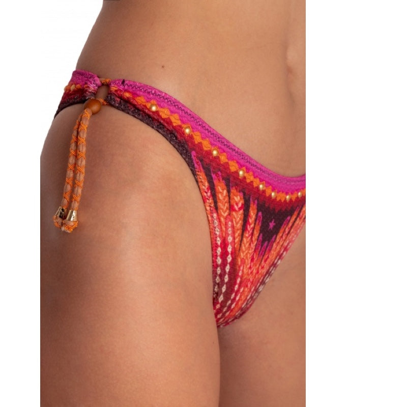 Bandeau bikini with extractable padding in corrugated Lycra and a placed print. The spoked stud work on the top enhances the neckline. Dainetto laces with central slider allow for different fastening styles. Briefs embellished with studs on the waist. In the reduced coverage version the adjustable side panels give a few centimeters for a better fit. Customized gold-plated nickel-free endings finish the garment.